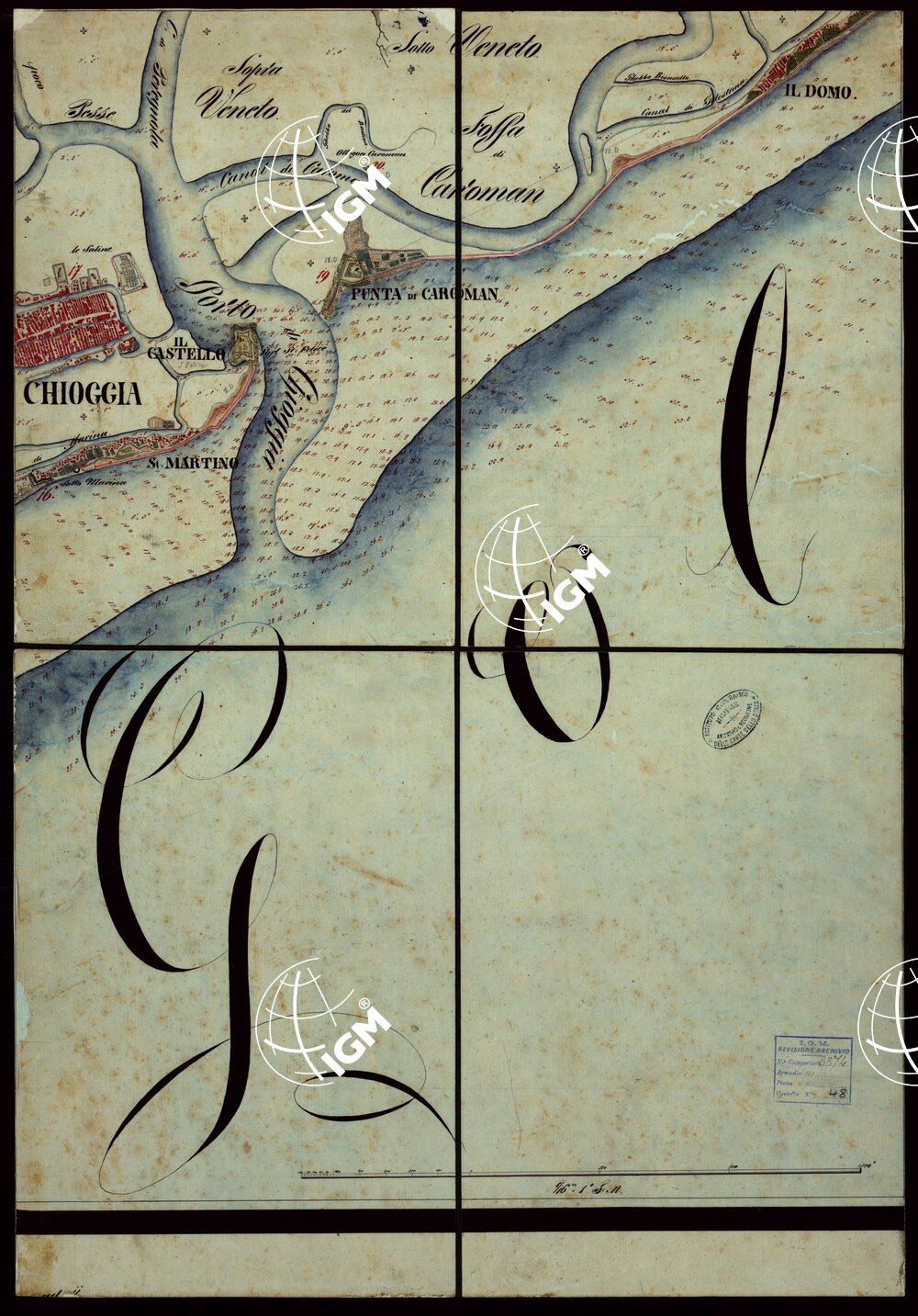 Copia della carta del Denaix eseguita dal 1800 al 1808 alla scala di 1:18.000 in trenta fogli. Il disegno fu eseguito nel 1836 la riduzione nel 1837 a spesa del Genio terrestre austriaco. Consta di trenta fogli ad acquarello montati su tela. Colori usati: azzurro per l’idrografia, rosso per gli abitati e le strade principali, verde per le coltivazioni. Il foglio 1 contiene il quadro di unione. I fogli 9 e 10 recano il titolo; il foglio 20 contiene notizie sulla costruzione della carta: il foglio 25 la rosa dei venti; il foglio 30 notizie sulla laguna. Annessi alla carta sono un piano del Forte di S.Pietro pure ad acquarello alla scala di 1:2.500 e una carta dei “sondaggi lungo la costa tra il Forte Alberone e la Batteria Quattro Fontane” firmata “Salis Soglio maggio 1847”.