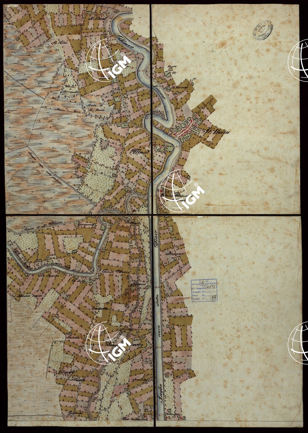 Copia della carta del Denaix eseguita dal 1800 al 1808 alla scala di 1:18.000 in trenta fogli. Il disegno fu eseguito nel 1836 la riduzione nel 1837 a spesa del Genio terrestre austriaco. Consta di trenta fogli ad acquarello montati su tela. Colori usati: azzurro per l’idrografia, rosso per gli abitati e le strade principali, verde per le coltivazioni. Il foglio 1 contiene il quadro di unione. I fogli 9 e 10 recano il titolo; il foglio 20 contiene notizie sulla costruzione della carta: il foglio 25 la rosa dei venti; il foglio 30 notizie sulla laguna. Annessi alla carta sono un piano del Forte di S.Pietro pure ad acquarello alla scala di 1:2.500 e una carta dei “sondaggi lungo la costa tra il Forte Alberone e la Batteria Quattro Fontane” firmata “Salis Soglio maggio 1847”.