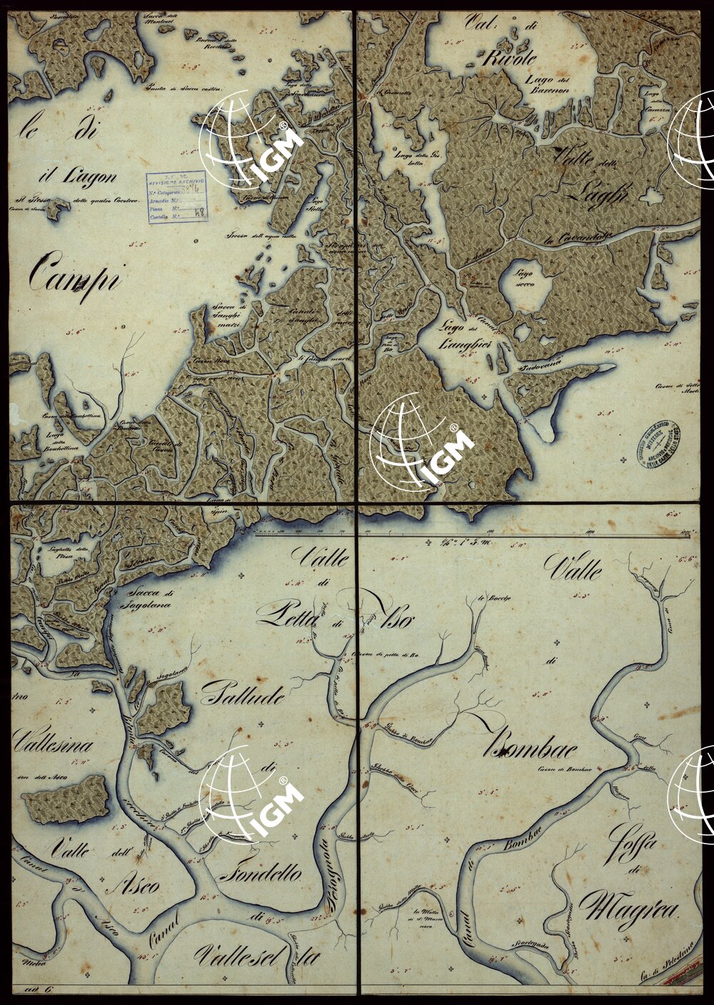 Copia della carta del Denaix eseguita dal 1800 al 1808 alla scala di 1:18.000 in trenta fogli. Il disegno fu eseguito nel 1836 la riduzione nel 1837 a spesa del Genio terrestre austriaco. Consta di trenta fogli ad acquarello montati su tela. Colori usati: azzurro per l’idrografia, rosso per gli abitati e le strade principali, verde per le coltivazioni. Il foglio 1 contiene il quadro di unione. I fogli 9 e 10 recano il titolo; il foglio 20 contiene notizie sulla costruzione della carta: il foglio 25 la rosa dei venti; il foglio 30 notizie sulla laguna. Annessi alla carta sono un piano del Forte di S.Pietro pure ad acquarello alla scala di 1:2.500 e una carta dei “sondaggi lungo la costa tra il Forte Alberone e la Batteria Quattro Fontane” firmata “Salis Soglio maggio 1847”.