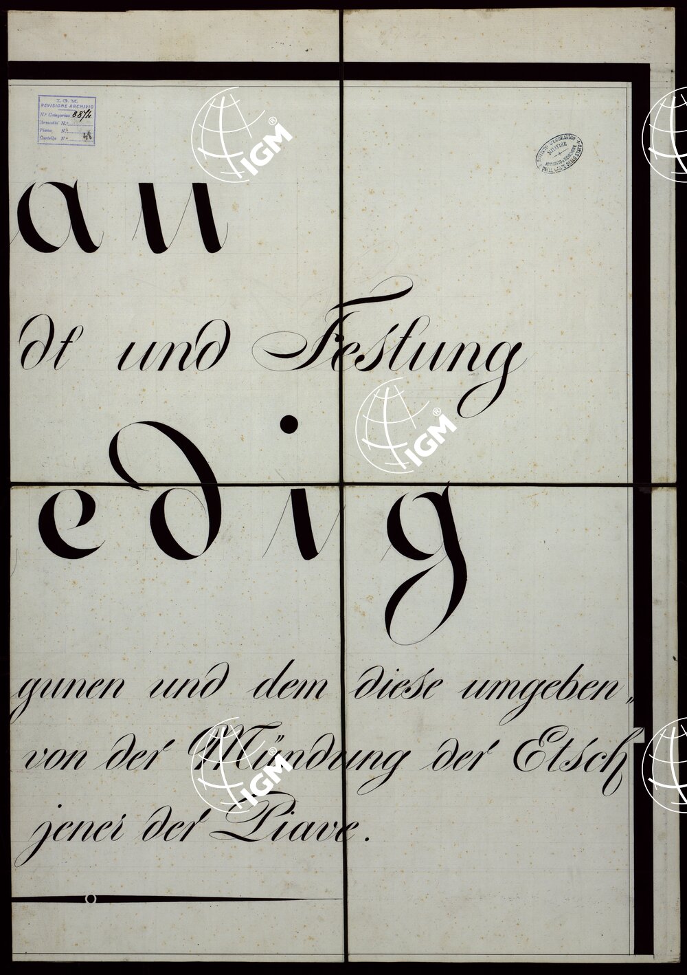 Copia della carta del Denaix eseguita dal 1800 al 1808 alla scala di 1:18.000 in trenta fogli. Il disegno fu eseguito nel 1836 la riduzione nel 1837 a spesa del Genio terrestre austriaco. Consta di trenta fogli ad acquerello montati su tela. Colori usati : azzurro per l’idrografia, rosso per gli abitati e le strade principali, verde per le coltivazioni. Il foglio 1 contiene il quadro di unione. I fogli 9 e 10 recano il titolo; il foglio 20 contiene notizie sulla costruzione della carta: il foglio 25 la rosa dei venti; il foglio 30 notizie sulla luguna. Annessi alla carta sono un piano del Forte di S.Pietro pure ad acquerello alla scala di 1:2.500 e una carta dei “sondaggi lungo la costa tra il Forte Alberone e la Batteria Quattro Fontane” firmata “Salis Soglio maggio 1847”.