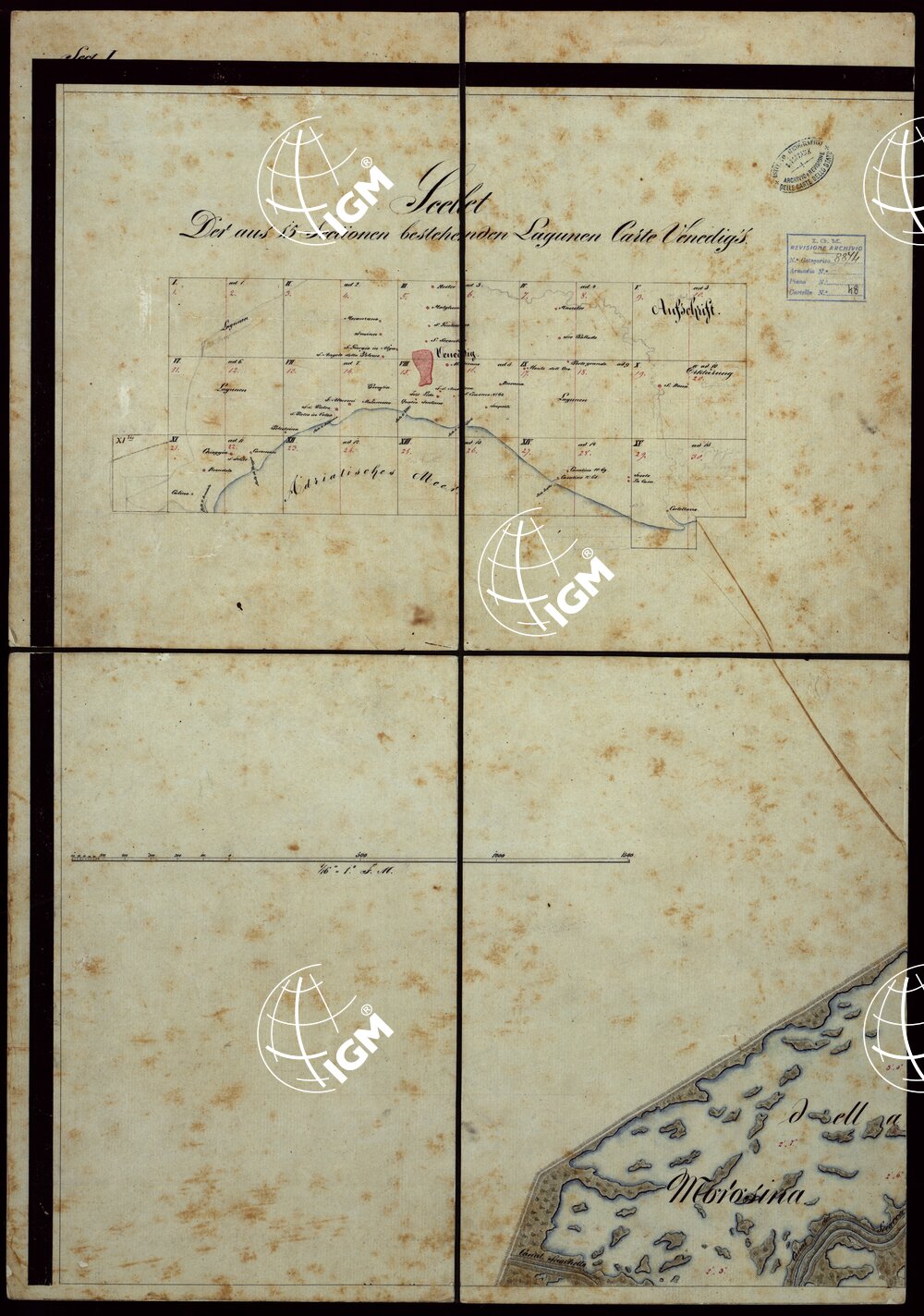 PLAN DER SEE-STADT ADT UND FESTUNG VENEDIG SAMMT HREN LAGUNEN UND DEM DIESE UMGEBEN DEN FESTEN LANDE VON DER MUNDUNG DER ETSCHRIS ZU JENER DER PIAVE. + CENNI SULLA COSTRUZIONE DELLA CARTA ANNO 1849 – FOGLIO 1 + QUADRO ED'UNIONE
