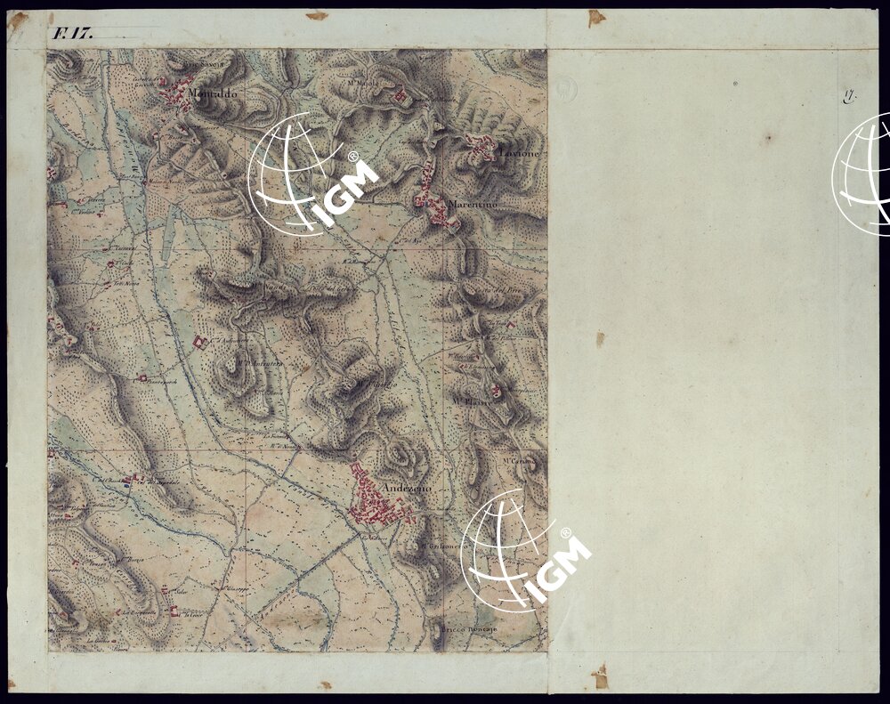 Il titolo non è presente sulla carta. La carta consta di 24 fogli. I primi quattro fogli provengono da ridisegni mentre gli altri venti sono rilievi originali di campagna e sono in parte costituiti da spezzoni riuniti. Orografia acquerellata a luce obliqua. Qualche foglio reca la firma dei tenenti Salius, Ricci e Morozzo.
