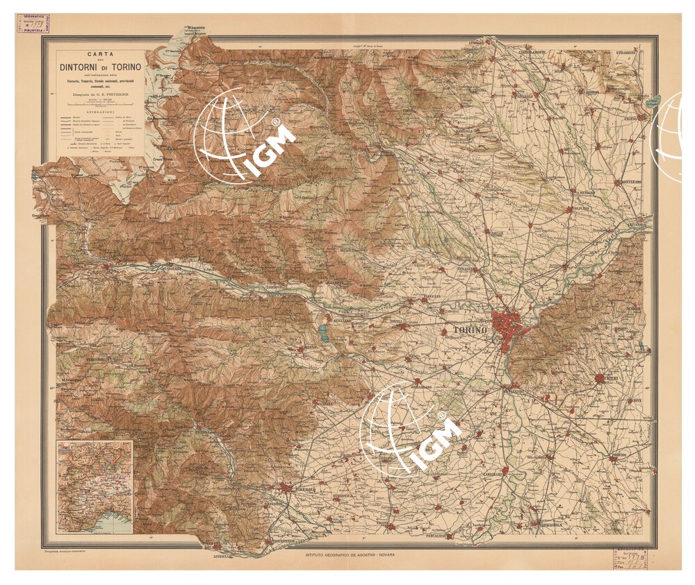 Carta con l’indicazione delle ferrovie, tramvie, strade nazionali, provinciali, comunali, ecc. Rappresentazione orografica a curve di livello e sfumo. Sotto il titolo è presente la legenda dei segni convenzionali. Nel riquadro in basso a destra una rappresentazione dell’Italia nord-occidentale.