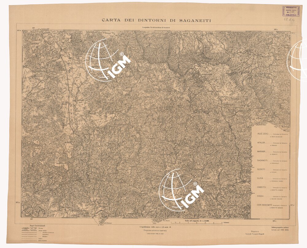 Riproduzione fotozincografica delle levate regolari eseguite dal Top. Grupelli nel 1907-1908. Terreno a curve di livello con equidistanza di 50 metri sussidiate da tratteggio. Sono segnate numerose quote altimetriche. Il terreno rappresentato è compreso fra 14° 50′ e 15° 06′ di lat. nord e fra 39° e 39° 17′ long. est Greenwich.