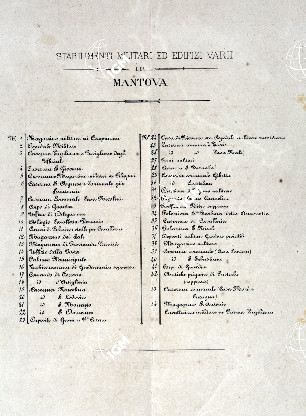 Carta in nove fogli in litografia, montati su tela, supposta eseguita dall’Ufficio Tecnico di Stato Maggiore prima della campagna del 1866. Distingue con particolare dettaglio e a colori le strade e le opere fortificatorie; mostra le ferrovie in nero e così pure i vari tipi di colture. Le acque sono in azzurro. Il foglio N° 1 contiene l’elenco degli stabilimenti militari ed edifici vari di Mantova: il foglio N° 9 reca la leggenda dei segni convenzionali.
