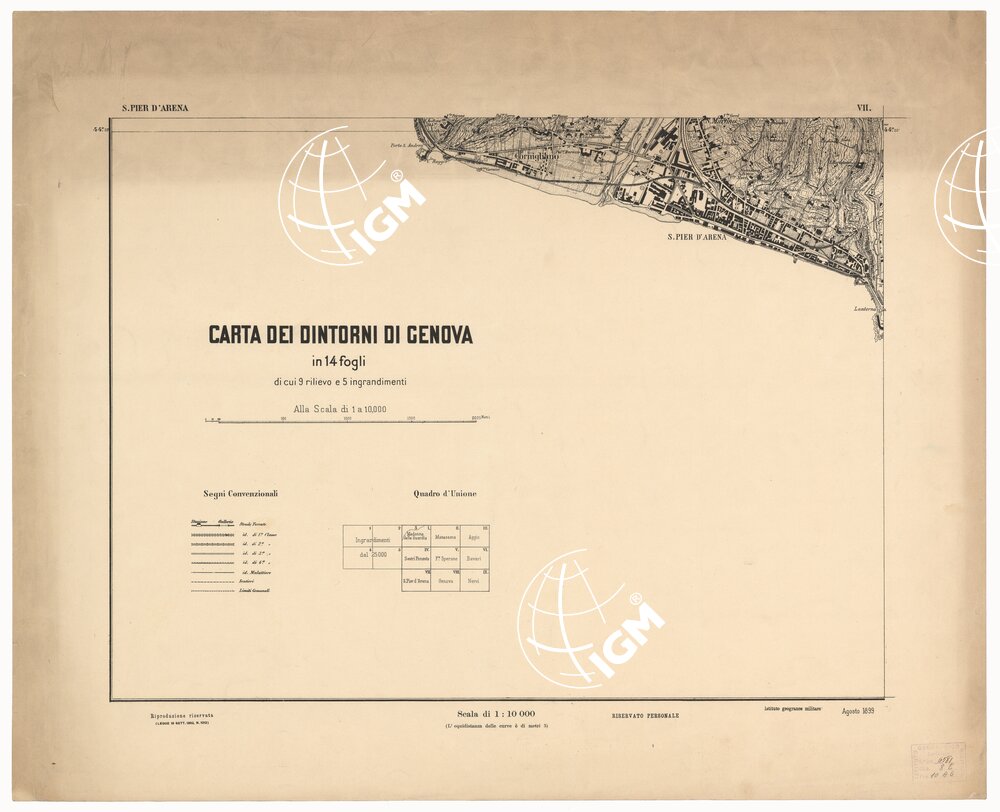 | Titolo proprio | CARTA DEI DINTORNI DI GENOVA IN 14 FOGLI DI CUI 9 RILIEVO E 5 INGRANDIMENTI – Foglio 7 – S. Pier d'Arena e Quadro d'Unione |