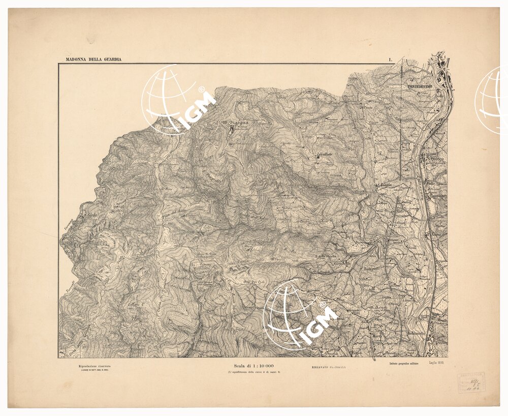 | Titolo proprio | CARTA DEI DINTORNI DI GENOVA IN 14 FOGLI DI CUI 9 RILIEVO E 5 INGRANDIMENTI – Foglio 1 – Madonna della Guardia |