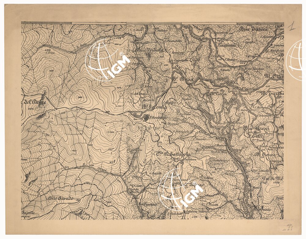 Rappresentazione orografica a curve di livello, l'equidistanza delle curve è di metri 20. I.G.M. (FI).