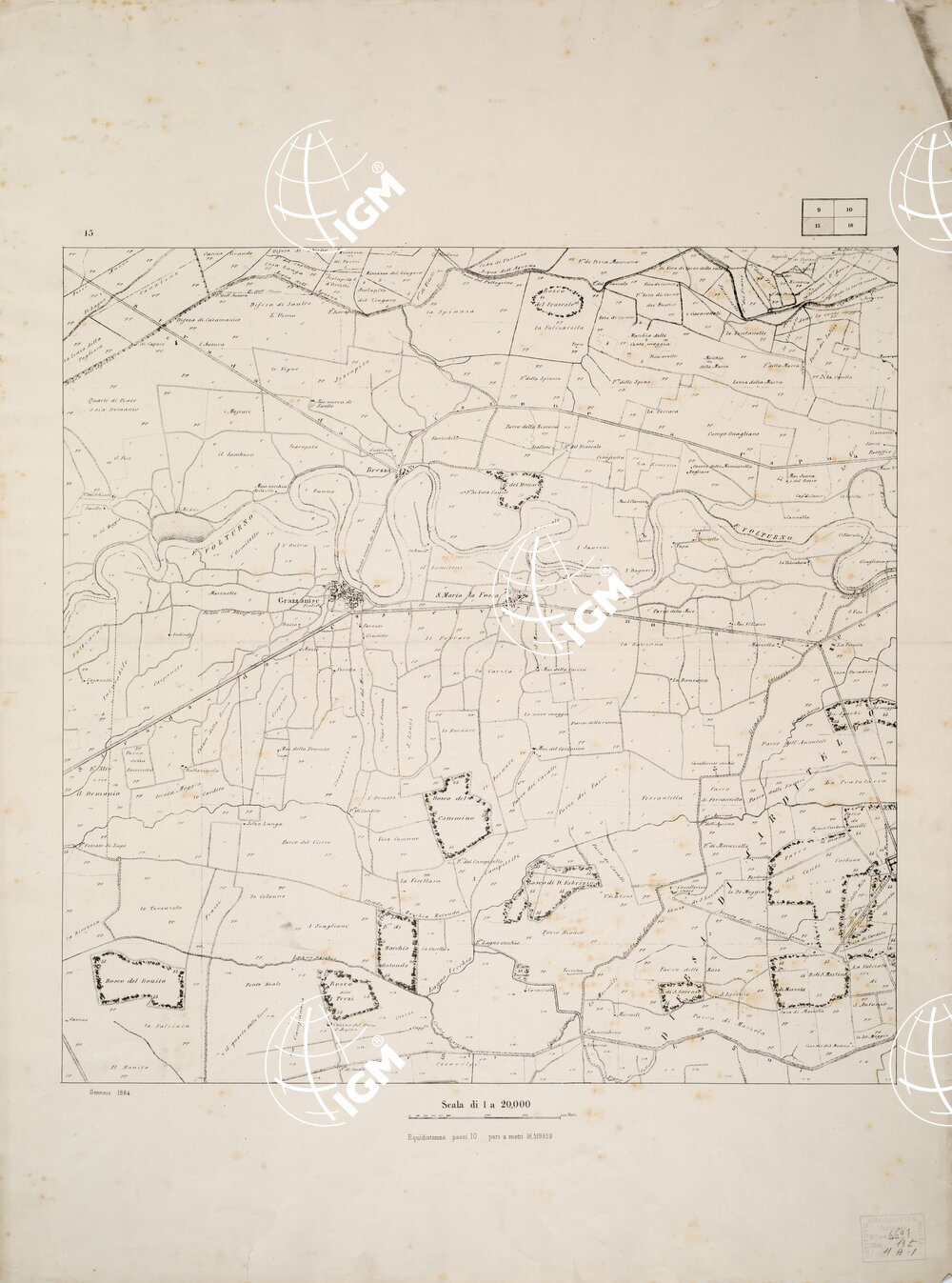 Carta in quattro fogli stampati in nero, con orografia a curve di livello tracciate all’equidistanza di 10 in 10 passi geodetici (m.18,519859). Annesso un quadro d’unione. Due copie. Una di queste copie si trova in archivio cartografico. (Pagina 438 del Catalogo Ragionato, Cartella d’Archivio N° 90 Documento N° 29).