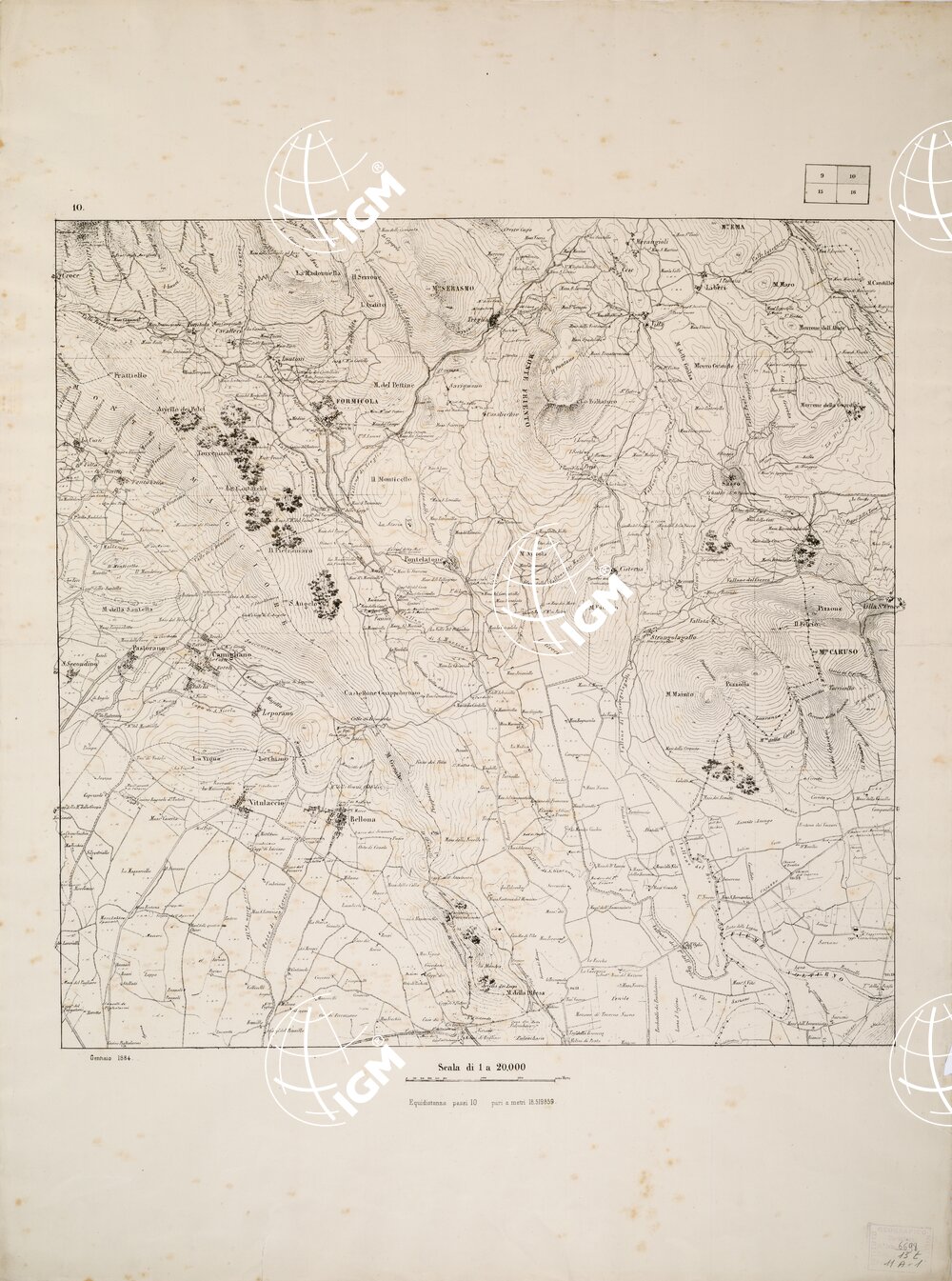 Carta in quattro fogli stampati in nero, con orografia a curve di livello tracciate all'equidistanza di 10 in 10 passi geodetici (m.18,519859). Annesso un quadro d'unione. Due copie. Una di queste copie si trova in archivio cartografico. (Pagina 438 del Catalogo Ragionato, Cartella d'Archivio N° 90 Documento N° 29).