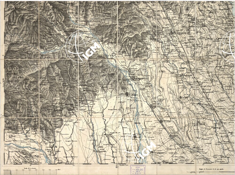 Carta derivante dalla "CARTA TOPOGRAFICA DEGLI STATI IN TERRAFERMA DI S.M. IL RE DI SARDEGNA"; cartella d'archivio n. 44 documento n. 77, inventario n. 3972, 81, 82.
