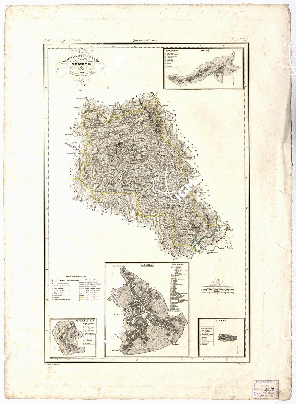 V. Stanghi e G. Maina incisori, V. Angeli scrisse. Nella carta sono presenti le piante di: Pienza, Siena, Montalcino e Colle Val d’Elsa; tutte nella proporzione di 1:12.500.