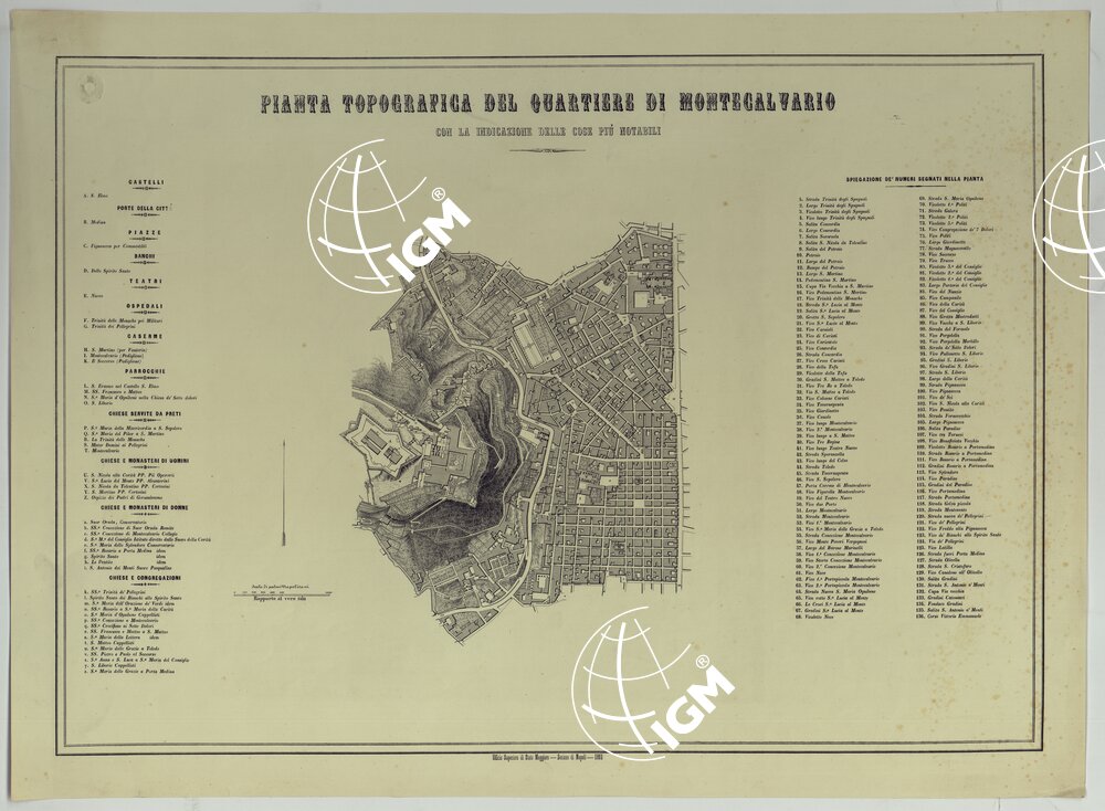 CARTA DEI DODICI QUARTIERI DI NAPOLI – PIANTA TOPOGRAFICA DEL QUARTIERE DI MONTECALVARIO CON LA INDICAZIONE DELLE COSE PIU’ NOTABILI.