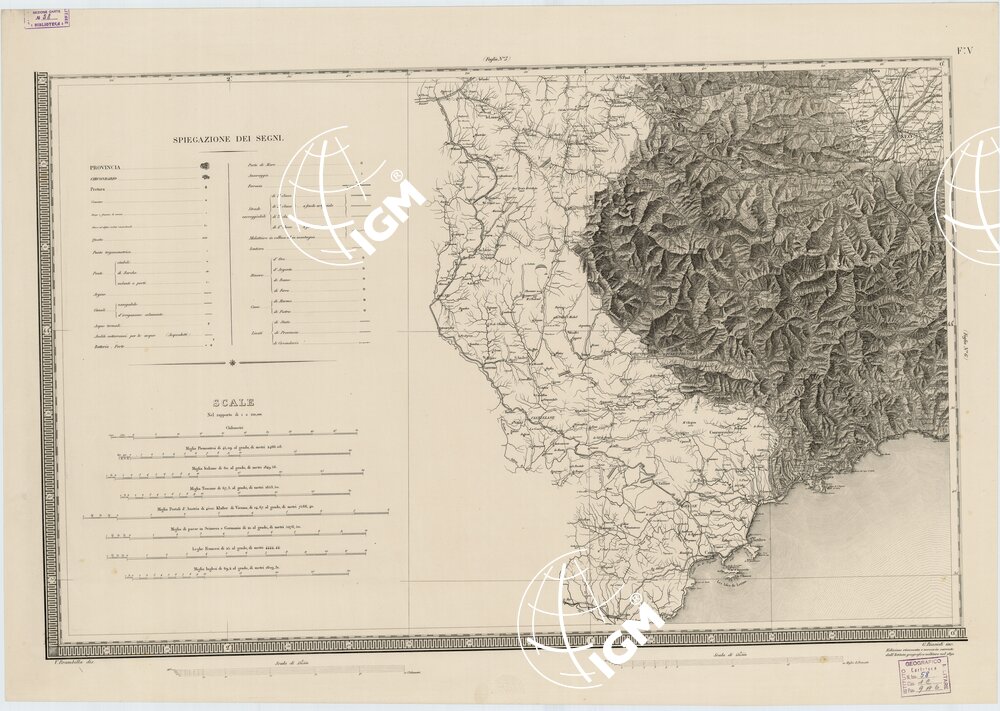 Carta pregevolissima in sei fogli incisi su rame da A. Lecoq. G. Arghinenti, G. Biasoli, stampati in nero, riduzione della Carta Topografica in 90 fogli alla scala di 1 : 50 000 dello stesso R. Corpo di S. M. Generale. Proiezione di Flamstead modificata. Origine delle coordinate il R. Osservatorio di Torino. Orografia rappresentata con fine artistico tratteggio a luce obliqua. Abitati distinti in base alla loro importanza amministrativa; strade classificate in reali, provinciali, carreggiabili, mulattiere e sentieri. Sono inoltre indicati ponti, argini, canali, acque termali, miniere, cave, ecc., e i confini di stato e di provincia. Il foglio N° 2 contiene il titolo e un ” Cenno sulla formazione della carta “. Il foglio N° 5 contiene la leggenda dei segni convenzionali e le scale grafiche (8, in misure antiche italiane ed estere). Nel foglio N° 6 trovasi una cartina sussidiaria per l’isola di Capraia (Cfr. A. MORI, La Cartografia Ufficiale in Italia e l’I.G.M., 1922, pagg. 22-24). Cinque copie d’archivio; quattro delle quali incise su rame (una mancante del foglio VI) ed una trasporto su pietra mancante del foglio IV. Gli esemplari n. 55, 55 bis, 57, 57 bis e 59 sono riproduzioni messe al corrente per gli anni 1859,1874,1883,1892 e 1898.
