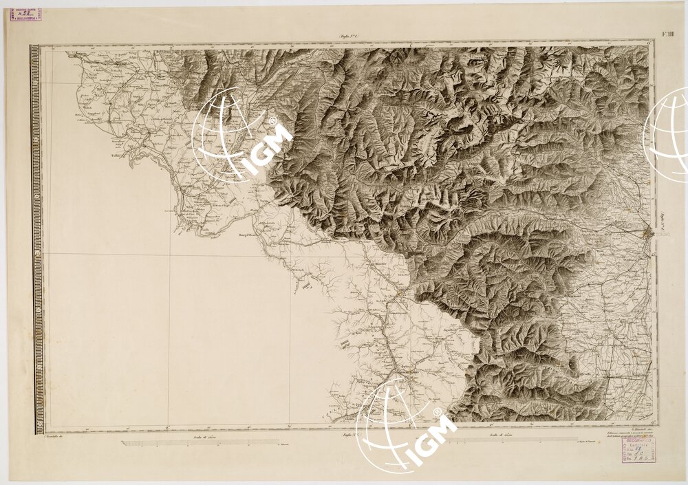 Carta pregevolissima in sei fogli incisi su rame da A. Lecoq. G. Arghinenti, G. Biasoli, stampati in nero, riduzione della Carta Topografica in 90 fogli alla scala di 1 : 50 000 dello stesso R. Corpo di S. M. Generale. Proiezione di Flamstead modificata. Origine delle coordinate il R. Osservatorio di Torino. Orografia rappresentata con fine artistico tratteggio a luce obliqua. Abitati distinti in base alla loro importanza amministrativa; strade classificate in reali, provinciali, carreggiabili, mulattiere e sentieri. Sono inoltre indicati ponti, argini, canali, acque termali, miniere, cave, ecc., e i confini di stato e di provincia. Il foglio N° 2 contiene il titolo e un ” Cenno sulla formazione della carta “. Il foglio N° 5 contiene la leggenda dei segni convenzionali e le scale grafiche (8, in misure antiche italiane ed estere). Nel foglio N° 6 trovasi una cartina sussidiaria per l’isola di Capraia (Cfr. A. MORI, La Cartografia Ufficiale in Italia e l’I.G.M., 1922, pagg. 22-24). Cinque copie d’archivio; quattro delle quali incise su rame (una mancante del foglio VI) ed una trasporto su pietra mancante del foglio IV. Gli esemplari n. 55, 55 bis, 57, 57 bis e 59 sono riproduzioni messe al corrente per gli anni 1859,1874,1883,1892 e 1898.