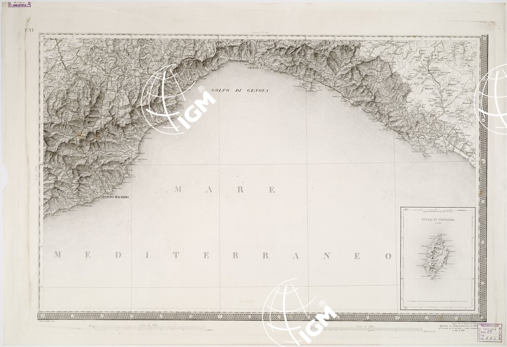 Carta pregevolissima in sei fogli incisi su rame da A. Lecoq. G. Arghinenti, G. Biasoli, stampati in nero, riduzione della Carta Topografica in 90 fogli alla scala di 1 : 50 000 dello stesso R. Corpo di S. M. Generale. Proiezione di Flamstead modificata. Origine delle coordinate il R. Osservatorio di Torino. Orografia rappresentata con fine artistico tratteggio a luce obliqua. Abitati distinti in base alla loro importanza amministrativa; strade classificate in reali, provinciali, carreggiabili, mulattiere e sentieri. Sono inoltre indicati ponti, argini, canali, acque termali, miniere, cave, ecc., e i confini di stato e di provincia. Il foglio N° 2 contiene il titolo e un ” Cenno sulla formazione della carta “. Il foglio N° 5 contiene la leggenda dei segni convenzionali e le scale grafiche (8, in misure antiche italiane ed estere). Nel foglio N° 6 trovasi una cartina sussidiaria per l’isola di Capraia (Cfr. A. MORI, La Cartografia Ufficiale in Italia e l’I.G.M., 1922, pagg. 22-24). Cinque copie d’archivio; quattro delle quali incise su rame (una mancante del foglio VI) ed una trasporto su pietra mancante del foglio IV. Gli esemplari n. 55, 55 bis, 57, 57 bis e 59 sono riproduzioni messe al corrente per gli anni 1859,1874,1883,1892 e 1898.