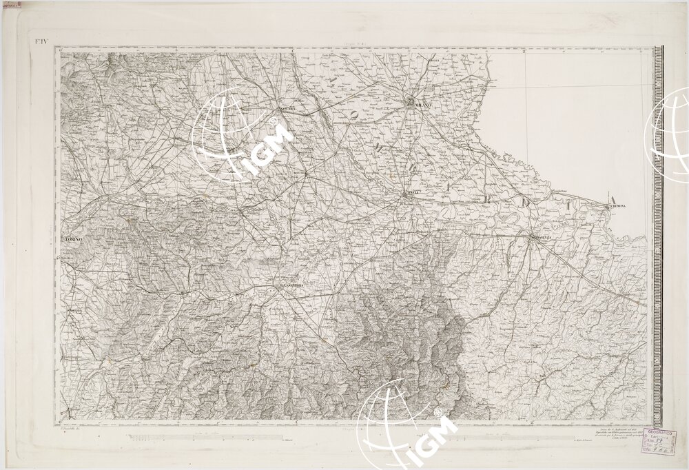 Carta pregevolissima in sei fogli incisi su rame da A. Lecoq. G. Arghinenti, G. Biasoli, stampati in nero, riduzione della Carta Topografica in 90 fogli alla scala di 1 : 50 000 dello stesso R. Corpo di S. M. Generale. Proiezione di Flamstead modificata. Origine delle coordinate il R. Osservatorio di Torino. Orografia rappresentata con fine artistico tratteggio a luce obliqua. Abitati distinti in base alla loro importanza amministrativa; strade classificate in reali, provinciali, carreggiabili, mulattiere e sentieri. Sono inoltre indicati ponti, argini, canali, acque termali, miniere, cave, ecc., e i confini di stato e di provincia. Il foglio N° 2 contiene il titolo e un ” Cenno sulla formazione della carta “. Il foglio N° 5 contiene la leggenda dei segni convenzionali e le scale grafiche (8, in misure antiche italiane ed estere). Nel foglio N° 6 trovasi una cartina sussidiaria per l’isola di Capraia (Cfr. A. MORI, La Cartografia Ufficiale in Italia e l’I.G.M., 1922, pagg. 22-24). Cinque copie d’archivio; quattro delle quali incise su rame (una mancante del foglio VI) ed una trasporto su pietra mancante del foglio IV. Gli esemplari n. 55, 55 bis, 57, 57 bis e 59 sono riproduzioni messe al corrente per gli anni 1859,1874,1883,1892 e 1898.