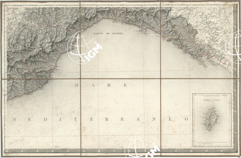 Carta pregevolissima in sei fogli incisi su rame da A. Lecoq. G. Arghinenti, G. Biasoli, stampati in nero, riduzione della Carta Topografica in 90 fogli alla scala di 1 : 50 000 dello stesso R. Corpo di S. M. Generale. Proiezione di Flamstead modificata. Origine delle coordinate il R. Osservatorio di Torino. Orografia rappresentata con fine artistico tratteggio a luce obliqua. Abitati distinti in base alla loro importanza amministrativa; strade classificate in reali, provinciali, carreggiabili, mulattiere e sentieri. Sono inoltre indicati ponti, argini, canali, acque termali, miniere, cave, ecc., e i confini di stato e di provincia. Il foglio N° 2 contiene il titolo e un ” Cenno sulla formazione della carta “. Il foglio N° 5 contiene la leggenda dei segni convenzionali e le scale grafiche (8, in misure antiche italiane ed estere). Nel foglio N° 6 trovasi una cartina sussidiaria per l’isola di Capraia (Cfr. A. MORI, La Cartografia Ufficiale in Italia e l’I.G.M., 1922, pagg. 22-24). Cinque copie d’archivio; quattro delle quali incise su rame (una mancante del foglio VI) ed una trasporto su pietra mancante del foglio IV. Gli esemplari n. 55, 55 bis, 57, 57 bis e 59 sono riproduzioni messe al corrente per gli anni 1859,1874,1883,1892 e 1898.