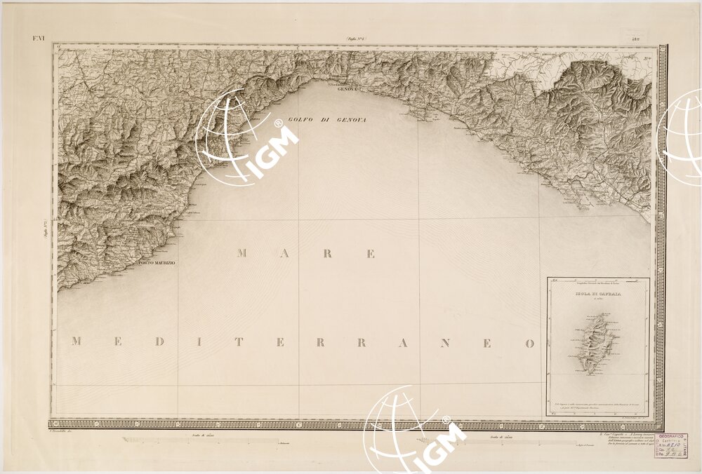 Carta pregevolissima in sei fogli incisi su rame da A. Lecoq. G. Arghinenti, G. Biasoli, stampati in nero, riduzione della Carta Topografica in 90 fogli alla scala di 1 : 50 000 dello stesso R. Corpo di S. M. Generale. Proiezione di Flamstead modificata. Origine delle coordinate il R. Osservatorio di Torino. Orografia rappresentata con fine artistico tratteggio a luce obliqua. Abitati distinti in base alla loro importanza amministrativa; strade classificate in reali, provinciali, carreggiabili, mulattiere e sentieri. Sono inoltre indicati ponti, argini, canali, acque termali, miniere, cave, ecc., e i confini di stato e di provincia. Il foglio N° 2 contiene il titolo e un ” Cenno sulla formazione della carta “. Il foglio N° 5 contiene la leggenda dei segni convenzionali e le scale grafiche (8, in misure antiche italiane ed estere). Nel foglio N° 6 trovasi una cartina sussidiaria per l’isola di Capraia (Cfr. A. MORI, La Cartografia Ufficiale in Italia e l’I.G.M., 1922, pagg. 22-24). Cinque copie d’archivio; quattro delle quali incise su rame (una mancante del foglio VI) ed una trasporto su pietra mancante del foglio IV. Gli esemplari n. 55, 55 bis, 57, 57 bis e 59 sono riproduzioni messe al corrente per gli anni 1859,1874,1883,1892 e 1898.