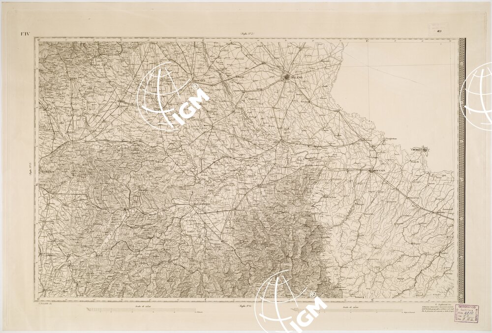 Carta pregevolissima in sei fogli incisi su rame da A. Lecoq. G. Arghinenti, G. Biasoli, stampati in nero, riduzione della Carta Topografica in 90 fogli alla scala di 1 : 50 000 dello stesso R. Corpo di S. M. Generale. Proiezione di Flamstead modificata. Origine delle coordinate il R. Osservatorio di Torino. Orografia rappresentata con fine artistico tratteggio a luce obliqua. Abitati distinti in base alla loro importanza amministrativa; strade classificate in reali, provinciali, carreggiabili, mulattiere e sentieri. Sono inoltre indicati ponti, argini, canali, acque termali, miniere, cave, ecc., e i confini di stato e di provincia. Il foglio N° 2 contiene il titolo e un ” Cenno sulla formazione della carta “. Il foglio N° 5 contiene la leggenda dei segni convenzionali e le scale grafiche (8, in misure antiche italiane ed estere). Nel foglio N° 6 trovasi una cartina sussidiaria per l’isola di Capraia (Cfr. A. MORI, La Cartografia Ufficiale in Italia e l’I.G.M., 1922, pagg. 22-24). Cinque copie d’archivio; quattro delle quali incise su rame (una mancante del foglio VI) ed una trasporto su pietra mancante del foglio IV. Gli esemplari n. 55, 55 bis, 57, 57 bis e 59 sono riproduzioni messe al corrente per gli anni 1859,1874,1883,1892 e 1898.
