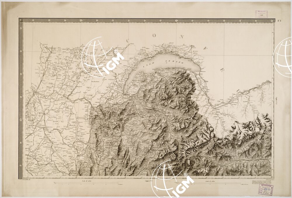 Carta pregevolissima in sei fogli incisi su rame da A. Lecoq. G. Arghinenti, G. Biasoli, stampati in nero, riduzione della Carta Topografica in 90 fogli alla scala di 1 : 50 000 dello stesso R. Corpo di S. M. Generale. Proiezione di Flamstead modificata. Origine delle coordinate il R. Osservatorio di Torino. Orografia rappresentata con fine artistico tratteggio a luce obliqua. Abitati distinti in base alla loro importanza amministrativa; strade classificate in reali, provinciali, carreggiabili, mulattiere e sentieri. Sono inoltre indicati ponti, argini, canali, acque termali, miniere, cave, ecc., e i confini di stato e di provincia. Il foglio N° 2 contiene il titolo e un ” Cenno sulla formazione della carta “. Il foglio N° 5 contiene la leggenda dei segni convenzionali e le scale grafiche (8, in misure antiche italiane ed estere). Nel foglio N° 6 trovasi una cartina sussidiaria per l’isola di Capraia (Cfr. A. MORI, La Cartografia Ufficiale in Italia e l’I.G.M., 1922, pagg. 22-24). Cinque copie d’archivio; quattro delle quali incise su rame (una mancante del foglio VI) ed una trasporto su pietra mancante del foglio IV. Gli esemplari n. 55, 55 bis, 57, 57 bis e 59 sono riproduzioni messe al corrente per gli anni 1859,1874,1883,1892 e 1898.