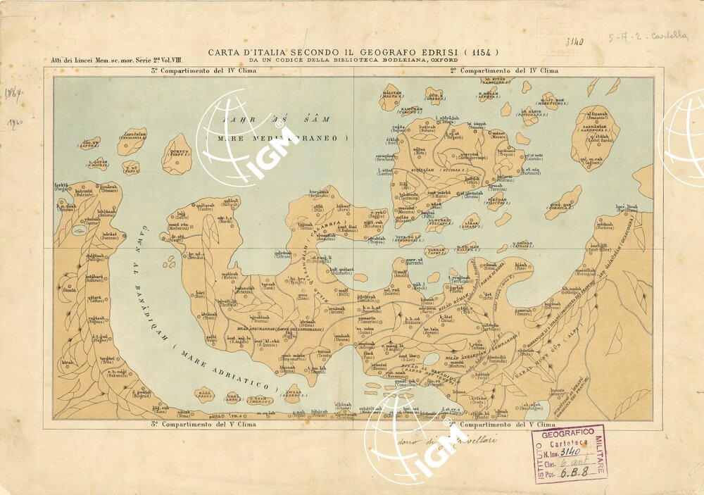 RIPRODUZIONE DELLA CARTA D’ITALIA SECONDO IL GEOGRAFO EDRISI DA UN CODICE DELLA BIBLIOTECA BODLEIANA OXFORD.