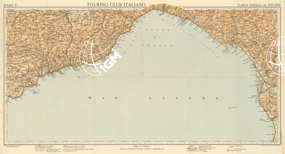 Rappresentazione orografica a sfumo. Ufficio Cartografico del T.C.I., capo cartografo P. Corbellini. In basso vi sono i segni convenzionali. Stampa: Officine Fotolitografiche, Milano.