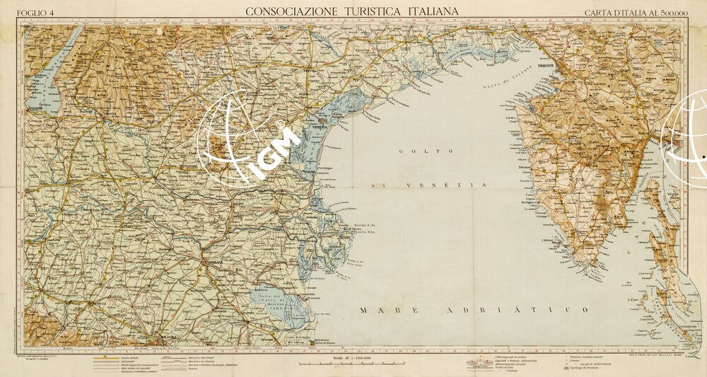 Rappresentazione orografica a sfumo. Ufficio Cartografico del T.C.I., cartografo P. Corbellini. In basso vi sono i segni convenzionali. Stampa: Officine Fotolitografiche S. A., Milano.