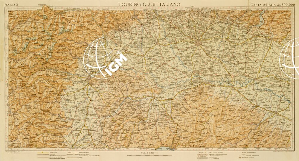 Rappresentazione orografica a sfumo. Ufficio Cartografico del T.C.I., capo cartografo P. Corbellini. In basso vi sono i segni convenzionali. Stampa: A. Vallardi, Milano.