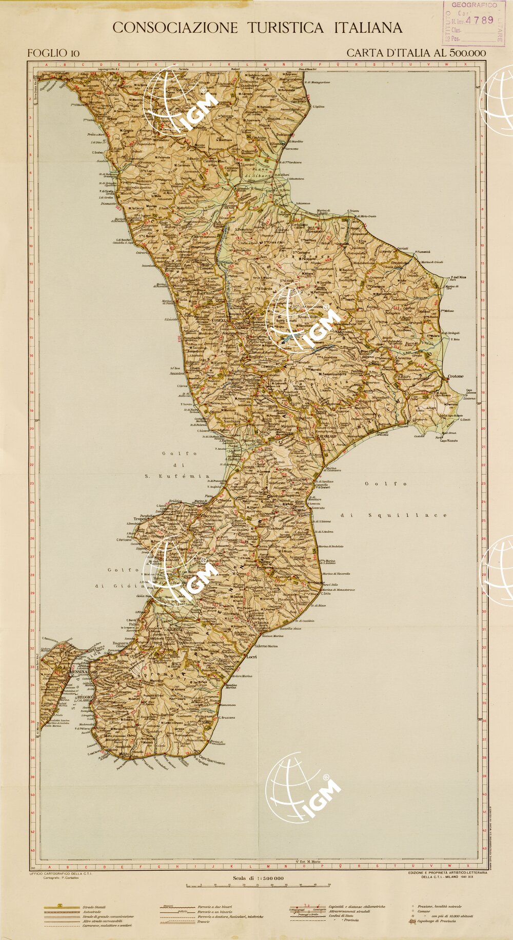 Rappresentazione orografica a sfumo. Ufficio Cartografico del T.C.I., cartografo P. Corbellini. In basso vi sono i segni convenzionali. Stampa: Officine Fotolitografiche S. A., Milano.