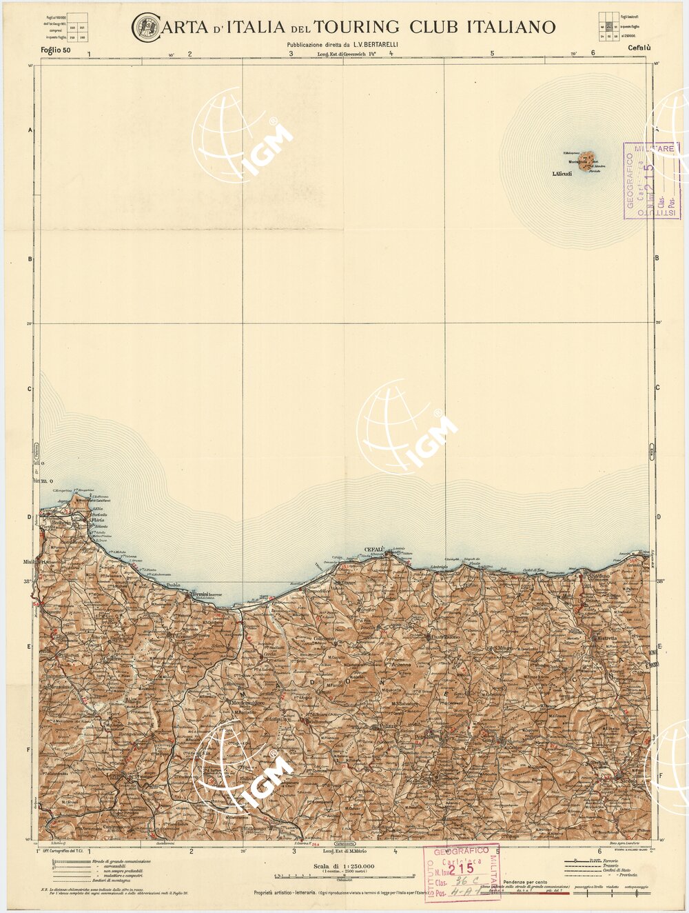 CARTA D’ITALIA DEL TOURING CLUB ITALIANO PUBBLICAZIONE DIRETTA DA L.V. BERTARELLI – Foglio 50 – Cefalù.
