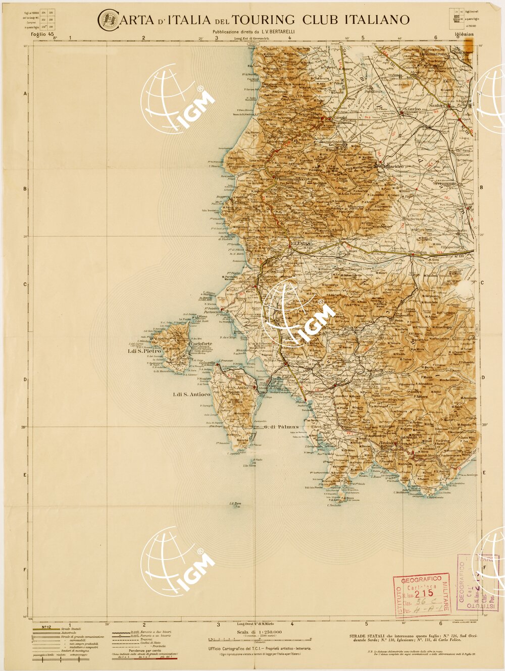 Rappresentazione orografica a tratteggio. In basso è presente l’elenco delle strade, le distanze chilometriche sono indicate dalle cifre in rosso. Le pendenze in percentuale sono indicate sulle strade di grande comunicazione. Per l’elenco completo dei segni convenzionali e delle abbreviazioni si rimanda al foglio n. 26.Touring Club Italiano, Milano. Proprietà artistico-letteraria; stampa A. Vallardi, Milano.