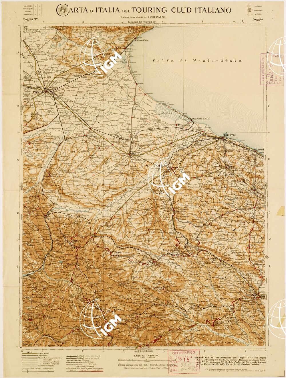 CARTA D’ITALIA DEL TOURING CLUB ITALIANO PUBBLICAZIONE DIRETTA DA L.V. BERTARELLI – Foglio 37 – Foggia.