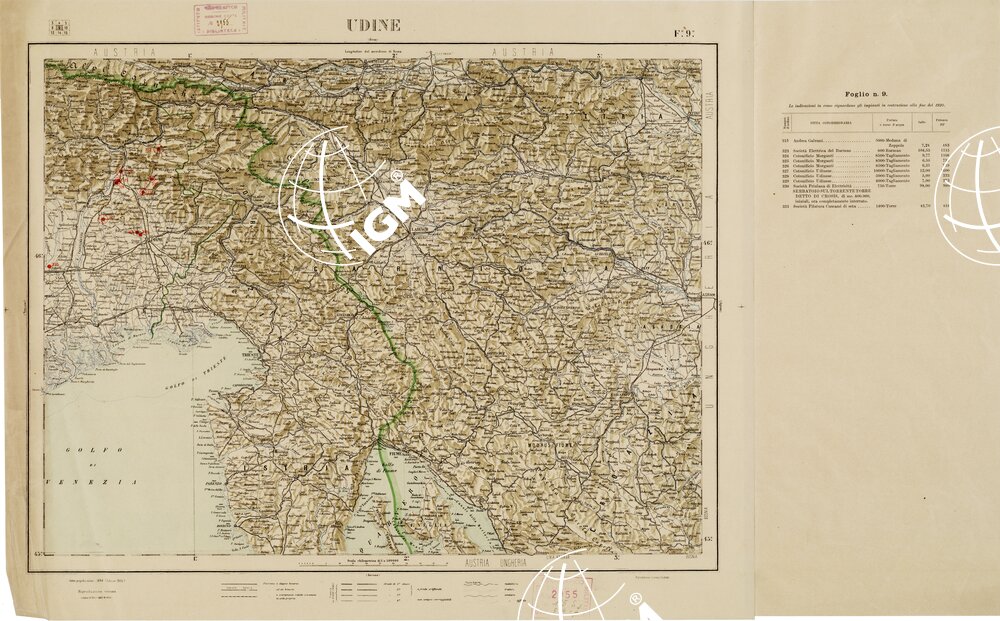 CARTA D’ITALIA CON LE INDICAZIONI DELLE CENTRALI PER LA PRODUZIONE DI ENERGIA ELETTRICA, ESISTENTI ED IN COSTRUZIONE A TUTTO L´ANNO 1920 – Foglio 9 UDINE