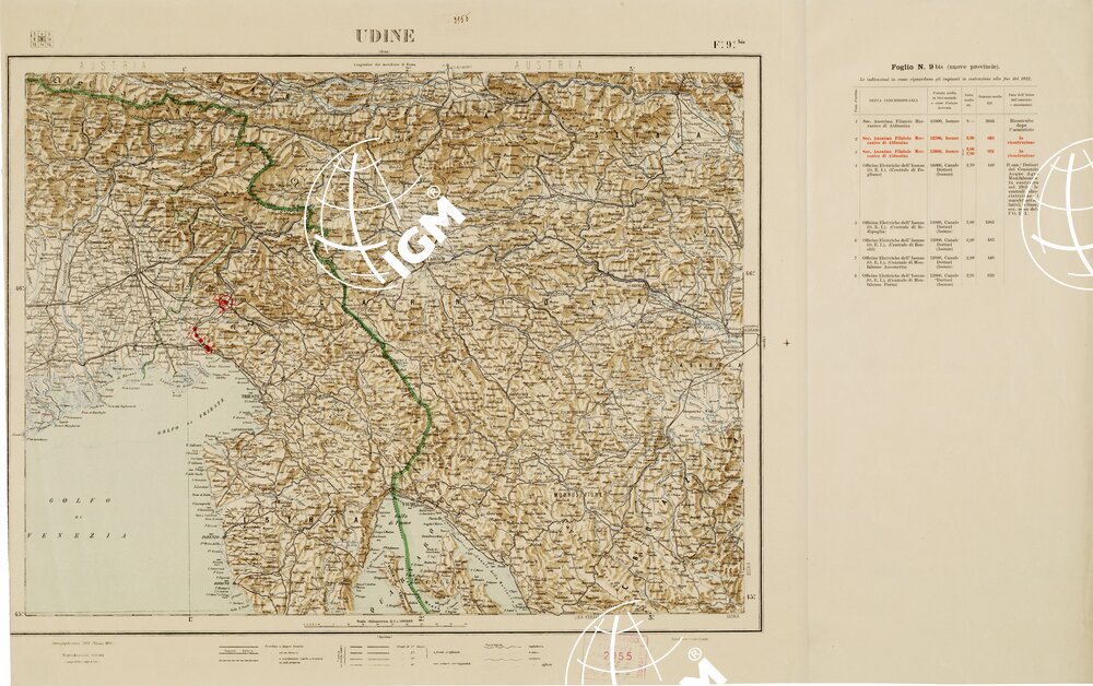 CARTA D’ITALIA CON LE INDICAZIONI DELLE CENTRALI PER LA PRODUZIONE DI ENERGIA ELETTRICA, ESISTENTI ED IN COSTRUZIONE A TUTTO L´ANNO 1920 – Foglio 9 BIS UDINE