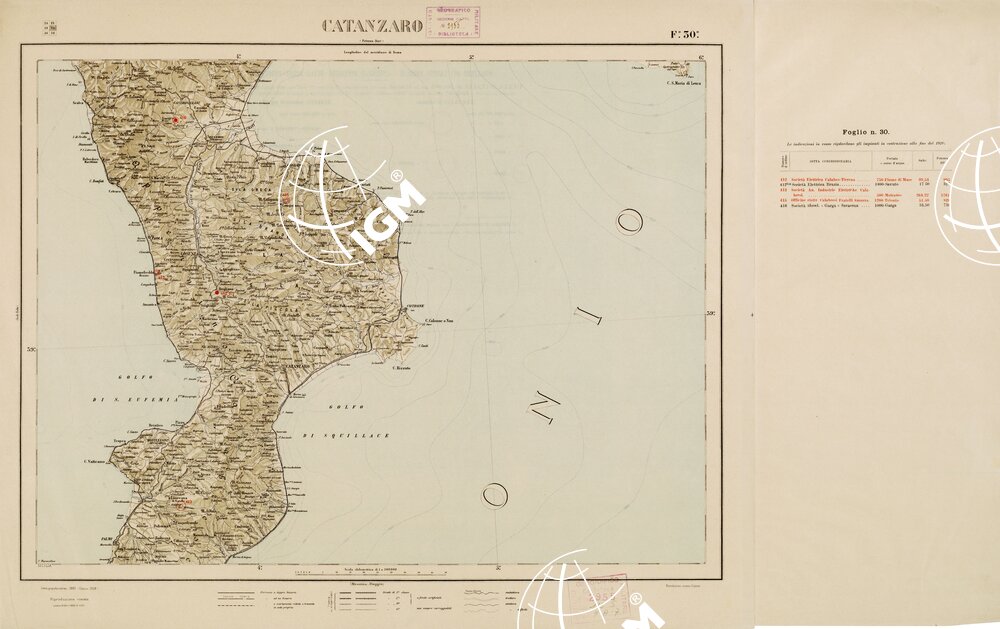 CARTA D’ITALIA CON LE INDICAZIONI DELLE CENTRALI PER LA PRODUZIONE DI ENERGIA ELETTRICA, ESISTENTI ED IN COSTRUZIONE A TUTTO L´ANNO 1920 – Foglio 30 CATANZARO