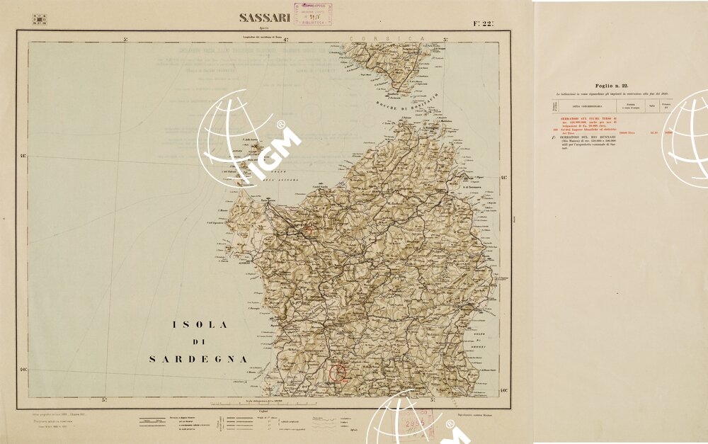 CARTA D’ITALIA CON LE INDICAZIONI DELLE CENTRALI PER LA PRODUZIONE DI ENERGIA ELETTRICA, ESISTENTI ED IN COSTRUZIONE A TUTTO L´ANNO 1920 – Foglio 22 SASSARI