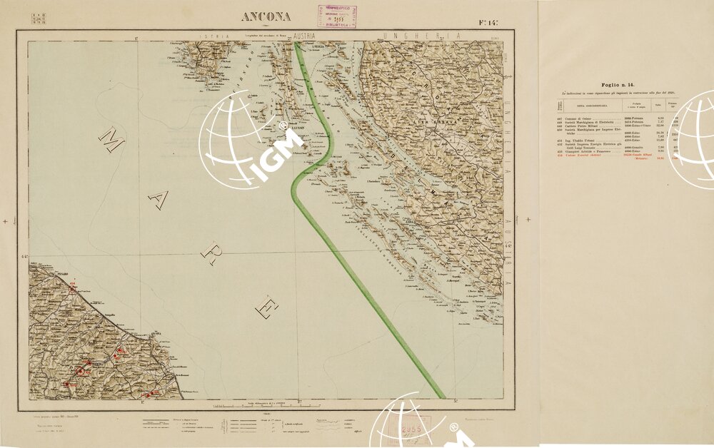 CARTA D’ITALIA CON LE INDICAZIONI DELLE CENTRALI PER LA PRODUZIONE DI ENERGIA ELETTRICA, ESISTENTI ED IN COSTRUZIONE A TUTTO L´ANNO 1920 – Foglio 14 ANCONA