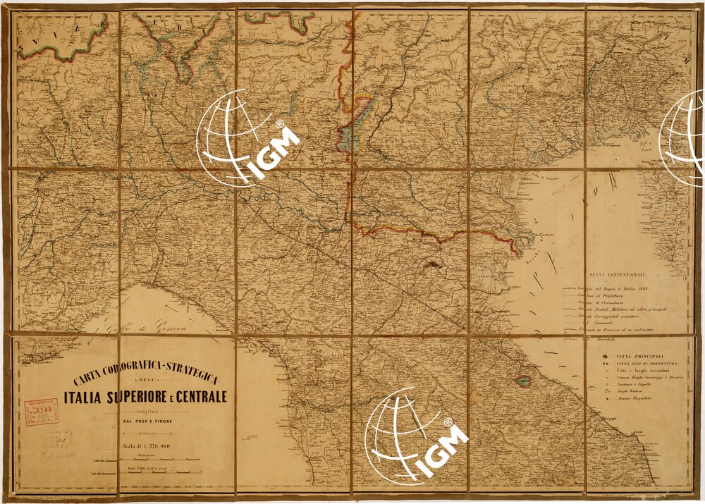 Un foglio montato su tela a stacchi. Rappresenta la sola planimetria con indicazione degli abitati distinti in base alla loro importanza amministrativa, santuari e cappelle, luoghi fortificati, stazioni telegrafiche, confini del Regno d’Italia al 1866 (a colori), confini amministrativi, strade postali, militari, carreggiabili secondarie, comunali, ferrovie in esercizio, in costruzione e in progetto, ecc. Le acque sono in azzurro. Due scale grafiche in chilometri e in miglia d’Italia.