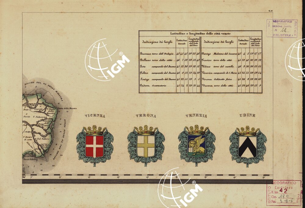Bella carta tratta da nitida incisione su rame stampata in nero con confini politici a colori. L’orografia è dimostrata a mezzo di fine tratteggio a luce obliqua. Alcuni dei fogli contengono piante delle città principali con annesso elenco numerico delle costruzioni principali. Altri contengono tabelle statistico-amministrative, elenchi delle coordinate dei luoghi più importanti, quadri e notizie intorno alla navigazione dei canali, i servizi ferroviari e telegrafici, ecc., il foglio E2 contiene una tavola dimostrativa in 1/4 il numero delle poste stabilito dell’una all’altra stazione nel Regno Lombardo Veneto colle relative competenze in base alla vigente tariffa. Due copie.