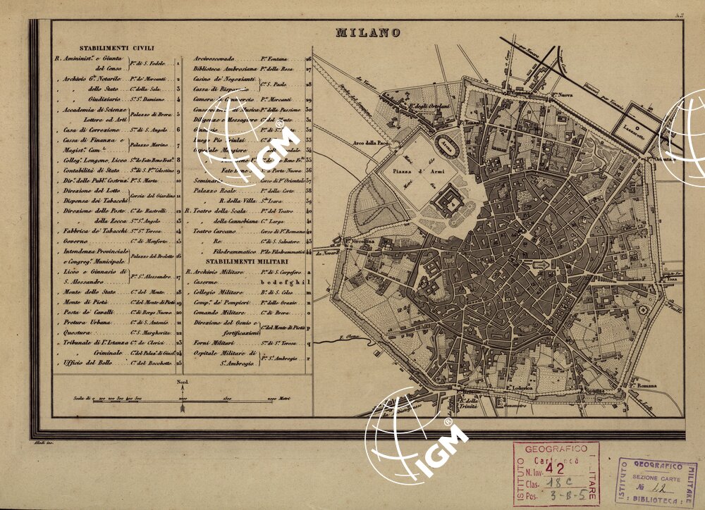 … DIVISA IN 48 FOGLI SULL’AMPIA SCALA DI 1:172.800 DEL NATURALE COLL’INDICAZIONE DELLE DISTANZE CHE CORRONO DA PAESE A PAESE SEGNATE SOPRA OGNI TRONCO DI STRADA IN MIGLIA GEOGRAFICHE ITALIANE DA 60 AL GRADO. COMPILATA DA ALESSANDRO MARIDATI. RIVEDUTA E AUTENTICATA DAI SINGOLI I. I. R. R. UFFICI PROVINCIALI DELLE PUBBLICHE COSTRUZIONI. MILANO 1858.