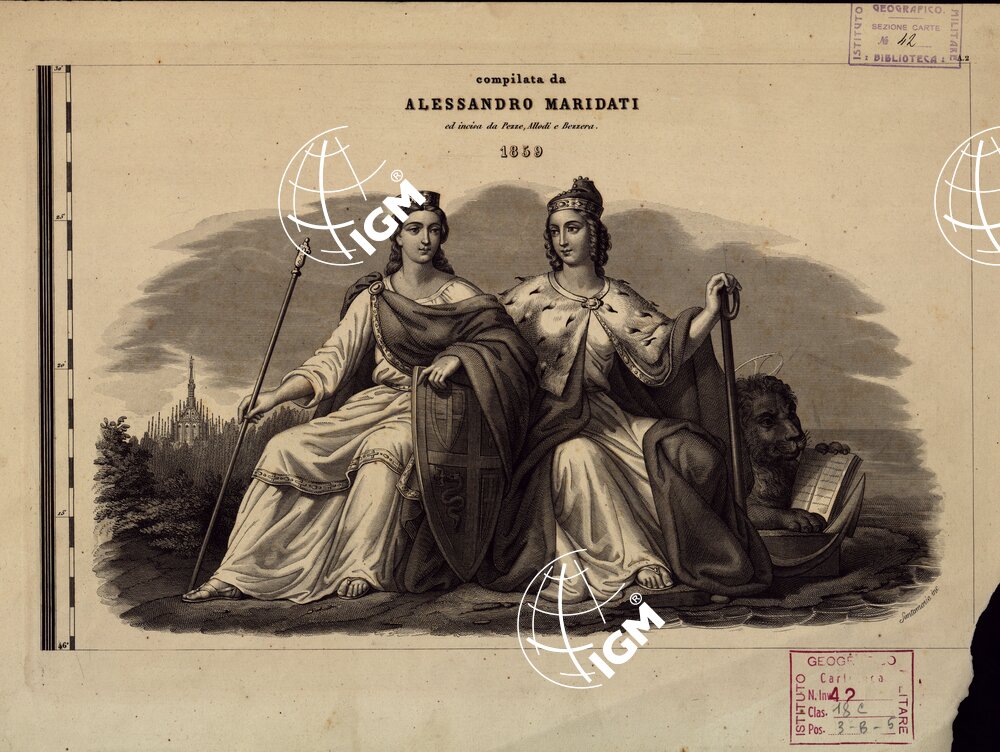 … DIVISA IN 48 FOGLI SULL’AMPIA SCALA DI 1:172.800 DEL NATURALE COLL’INDICAZIONE DELLE DISTANZE CHE CORRONO DA PAESE A PAESE SEGNATE SOPRA OGNI TRONCO DI STRADA IN MIGLIA GEOGRAFICHE ITALIANE DA 60 AL GRADO. COMPILATA DA ALESSANDRO MARIDATI. RIVEDUTA E AUTENTICATA DAI SINGOLI I. I. R. R. UFFICI PROVINCIALI DELLE PUBBLICHE COSTRUZIONI. MILANO 1858.