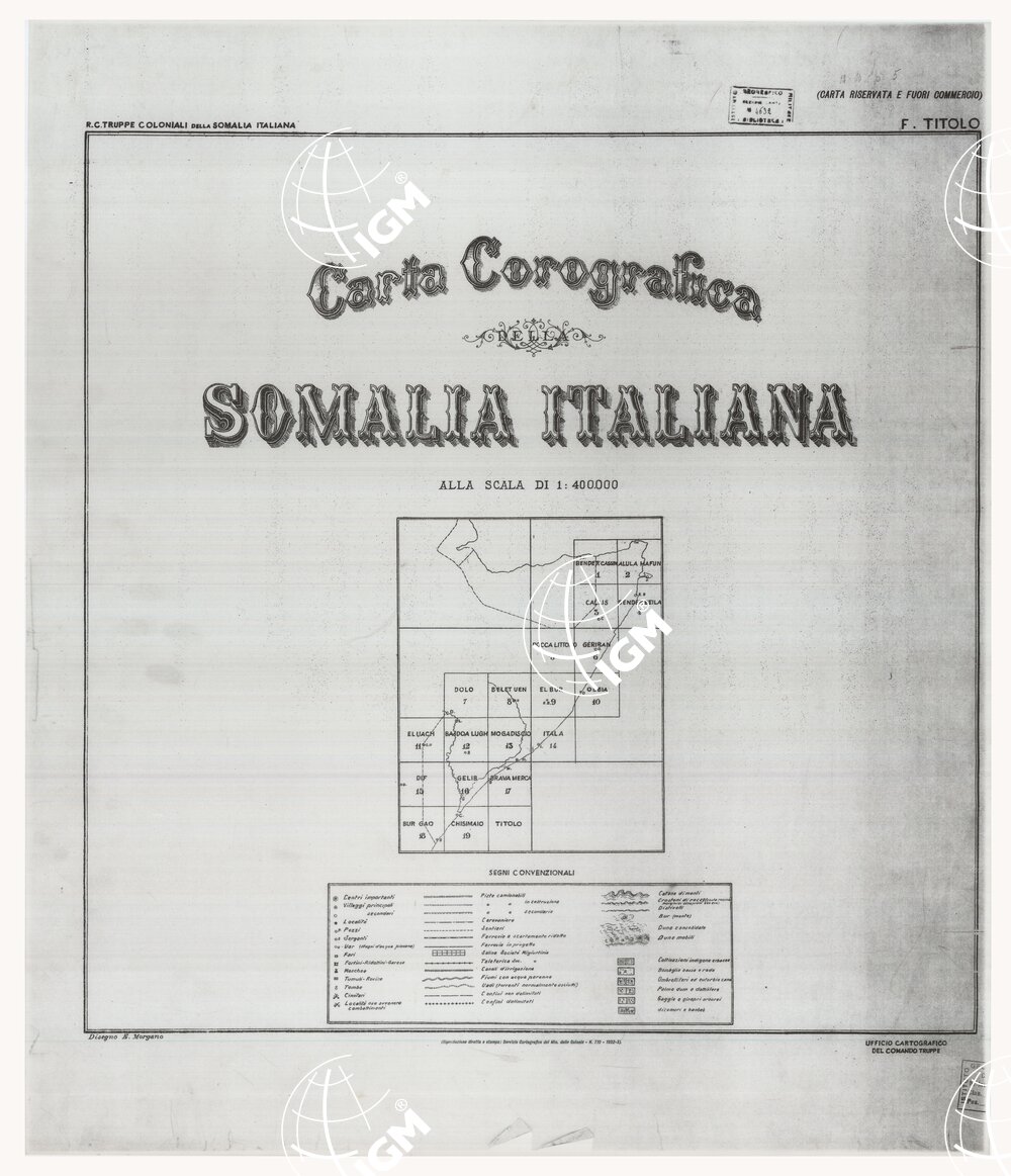 La carta è stata costruita ad uso dei reparti del Regio Corpo di Truppe Coloniali al fine di consentire una prima conoscenza del terreno ed una prima visione di orientamento necessaria in occasione di spostamenti militari: sia a scopo addestrativo sia a scopo logistico. Fin dal 1929 venne iniziato il riordinamento del materiale grafico di cui il Comando delle Truppe disponeva e quindi intrapreso il lavoro di riporto su tavolette. Il lavoro di riproduzione con procedimento eliografico venne iniziato nel 1930. La carta consta di 19 fogli i cui titoli sono: 1) Bender Cassim; 2) Alula Hafun; 3) Callis; 4) Bender Beila; 5) Rocca Littorio; 6) Geriban; 7) Dolo; 8) Belet Uen; 9) El Bur; 10) Obbia; 11) El-Uach; 12) Baidoa; 13) Mogadiscio; 14) Itala; 15) Dif; 16) Gelib; 17) Brava-Merca; 18) Bur Gao; 19) Chisimaio. Ciascun foglio contiene 2° di latitudine per 2° di longitudine. I segni convenzionali sono quelli in uso presso l’I.G.M. con aggiunta di segni particolari per alcuni aspetti topografici locali. Disegnatore E. Morgano. La carta è pubblicata in due tipi: in eliografia su fogli legati ad album con annessa nota illustrativa circa la costruzione e la compilazione; in litografia su fogli sciolti, in nero, con annesso quadro d’unione su cui è riportata anche la leggenda dei segni. Tavola 2 + Quadro d’unione