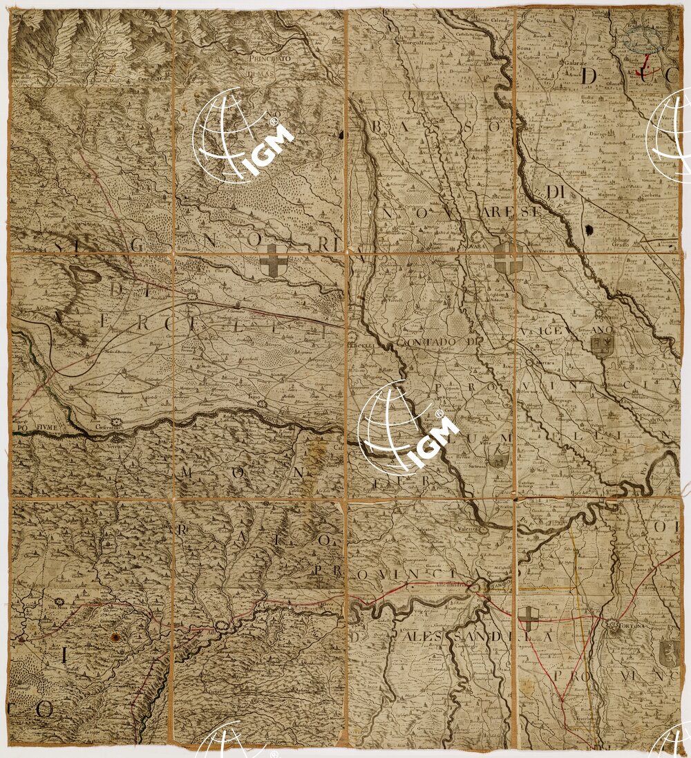 Nuova edizione della così detta “Carta di Madama Reale” costruita dall’ingegnere cartografo G. T. Borgonio disegnatore e calligrafo, addetto fin dal 1650 alla corte Sabauda, e pubblicata nel 1680 in 15 fogli incisi su rame. La carta del Borgonio rappresenta un grande progresso nella cartografia del Piemonte essendo essa di gran lunga superiore alle precedenti produzioni cartografiche di quella regione. Per quanto non poggiata su una vera e propria base geometrica, sì da doverne accusare l’inesattezza nell’orientamento e nella misura delle distanze, essa nondimeno è particolarmente pregevole sia per la ricchezza di informazioni relative agli abitati, strade, corsi d’acqua, sia per la rappresentazione dell’orografia efficacemente dimostrata alla cavaliera. La carta del Borgonio rimase famosa ed apprezzata per circa un secolo e mezzo: ad essa si ispirarono successivi cartografi come il Coronelli, De Fer, Mortier, R. de Vaugondy. Divenuta rarissima se ne pubblicarono nuove edizioni una delle quali a Londra nel 1765 a cura di A. Dury, e l’altra a Torino nel 1772 a cura dell’incisore piemontese Stagnone tratta dagli stessi rami del Borgonio ma corretti ed arricchiti, e con l’aggiunta di nuovi sì da estendere la carta alla Liguria e a parte della Lombardia.
