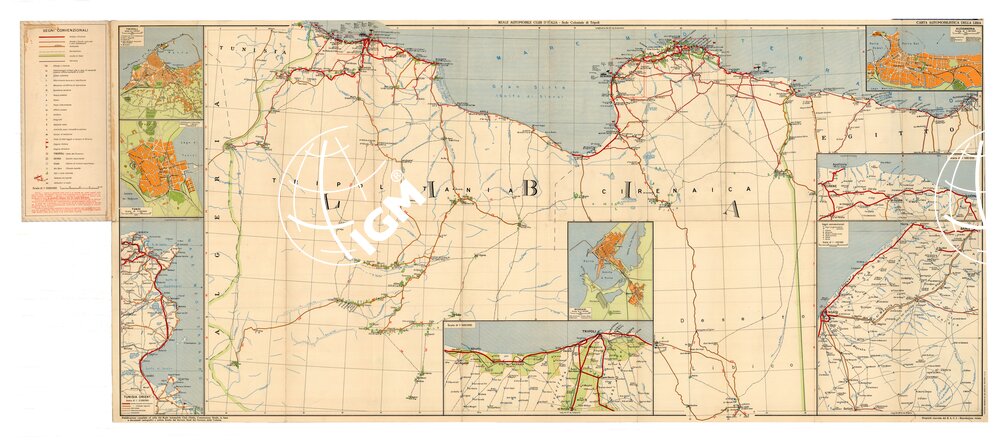 Autore Reale Automobil Club – Sede Coloniale di Tripoli. Pubblicazione compilata ed edita dal Reale Automobile Club Italia, Commissione strade, in base a documenti cartografici e notizie fornite dal Servizio Studi del Governo della Colonia. Stampata dall’ Istituto Geografico De Agostini di Novara. La Carta presenta ai suoi margini otto carte dettagliate delle seguenti città :