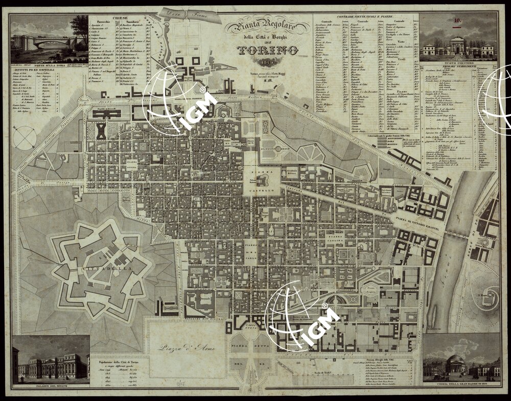 Torino, presso Gio Batta Maggi. Foglio unico stampato in nero, sussidiato da elenco numerico delle strade degli edifici pubblici. Agli angoli vedute. Vedi anche N°2 Coll. Regalia; questa copia distingue a colori le 4 sezioni della citta’: Moncenisio, Dora, Monviso, Po.