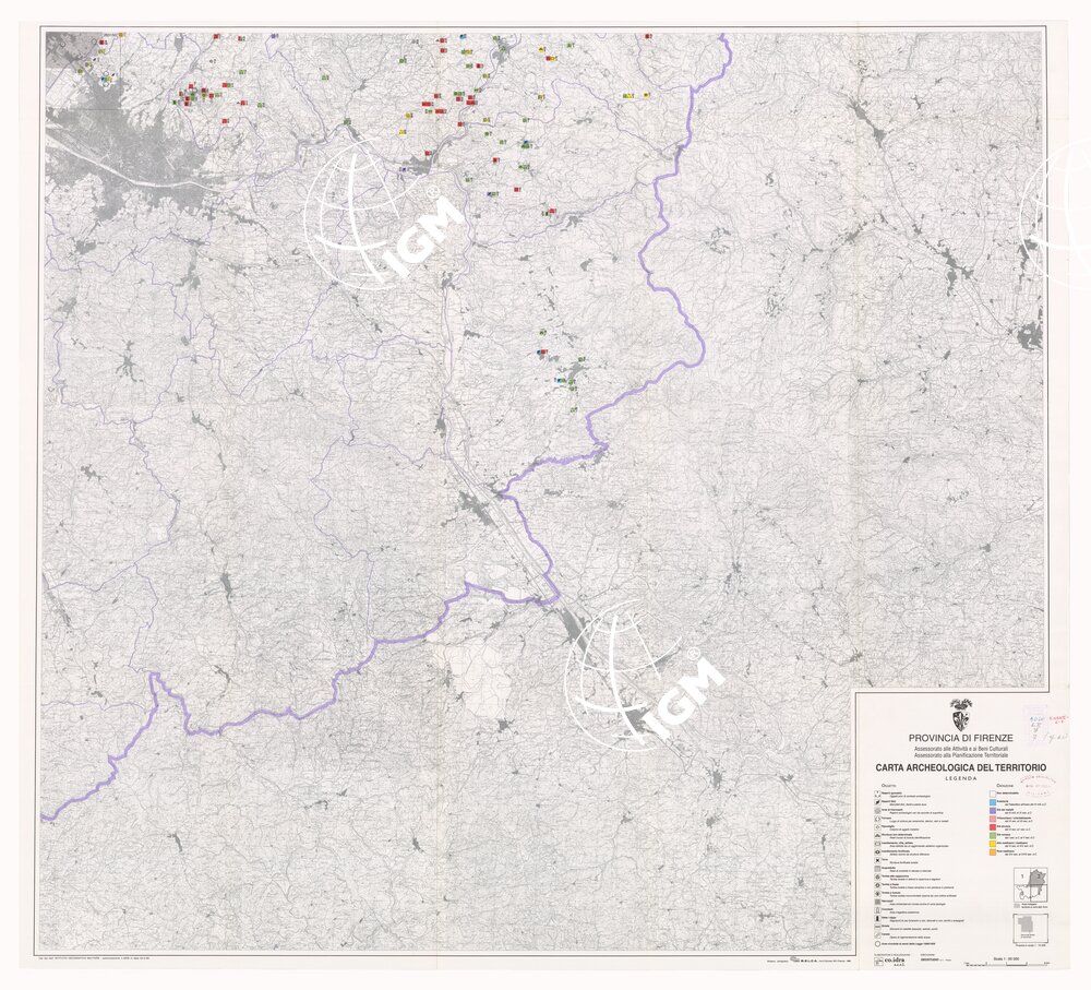 Provincia di Firenze, Assessorato alle Attività ed ai Beni Culturali e Assessorato alla Pianificazione Territoriale. Rappresentazione orografica a curve di livello. La carta è composta da 4 fogli 1:50.000 e 3 sezioni 1:10.000, vi sono annessi 3 fascicoli di testo.
