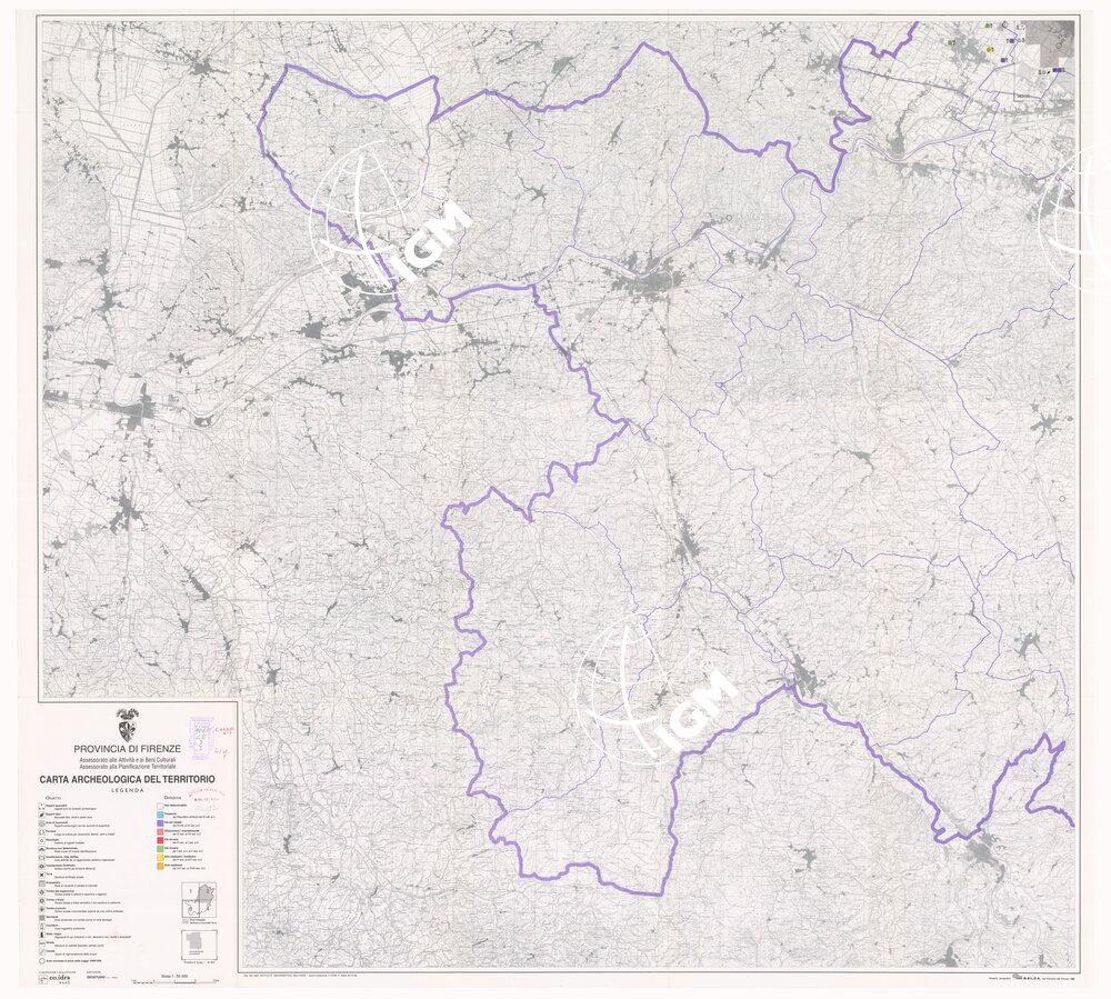 Provincia di Firenze, Assessorato alle Attività ed ai Beni Culturali e Assessorato alla Pianificazione Territoriale. Rappresentazione orografica a curve di livello. La carta è composta da 4 fogli 1:50.000 e 3 sezioni 1:10.000, vi sono annessi 3 fascicoli di testo.