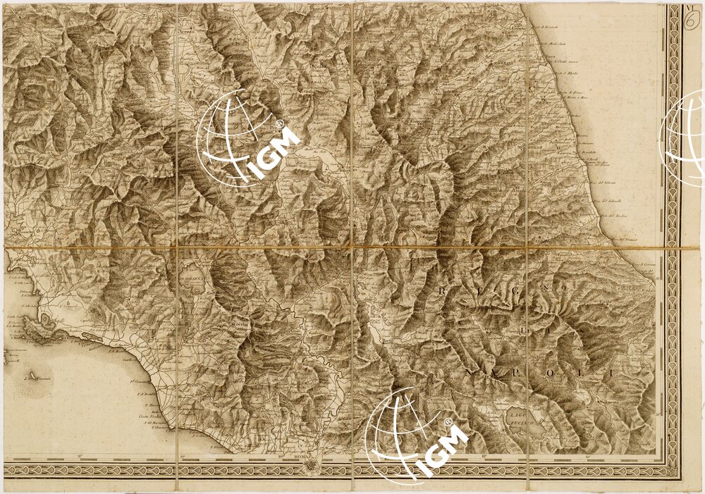 …COI SUOI STABILIMENTI POLITICI, MILITARI, CIVILI E RELIGIOSI E CON UNA PARTE DEGLI STATI LIMITROFI. COSTRUITA NEL DEPOSITO DELLA GUERRA PER ORDINE DEL MINISTRO DELLA GUERRA E MARINA NELL’ANNO MDCCCXI. AGGIUNTA E CORRETTA NELL’ANNO 1813. LA PRESENTE CARTA E’ STATA INCISA SOTTO LA VIGILANZA DEL SIG. G. BORDIGA CAPO INCISORE NEL DEPOSITO DELLA GUERRA.