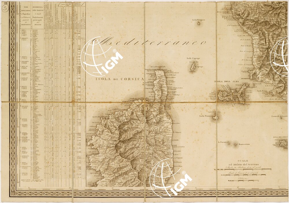 …COI SUOI STABILIMENTI POLITICI, MILITARI, CIVILI E RELIGIOSI E CON UNA PARTE DEGLI STATI LIMITROFI. COSTRUITA NEL DEPOSITO DELLA GUERRA PER ORDINE DEL MINISTRO DELLA GUERRA E MARINA NELL’ANNO MDCCCXI. AGGIUNTA E CORRETTA NELL’ANNO 1813. LA PRESENTE CARTA E’ STATA INCISA SOTTO LA VIGILANZA DEL SIG. G. BORDIGA CAPO INCISORE NEL DEPOSITO DELLA GUERRA.